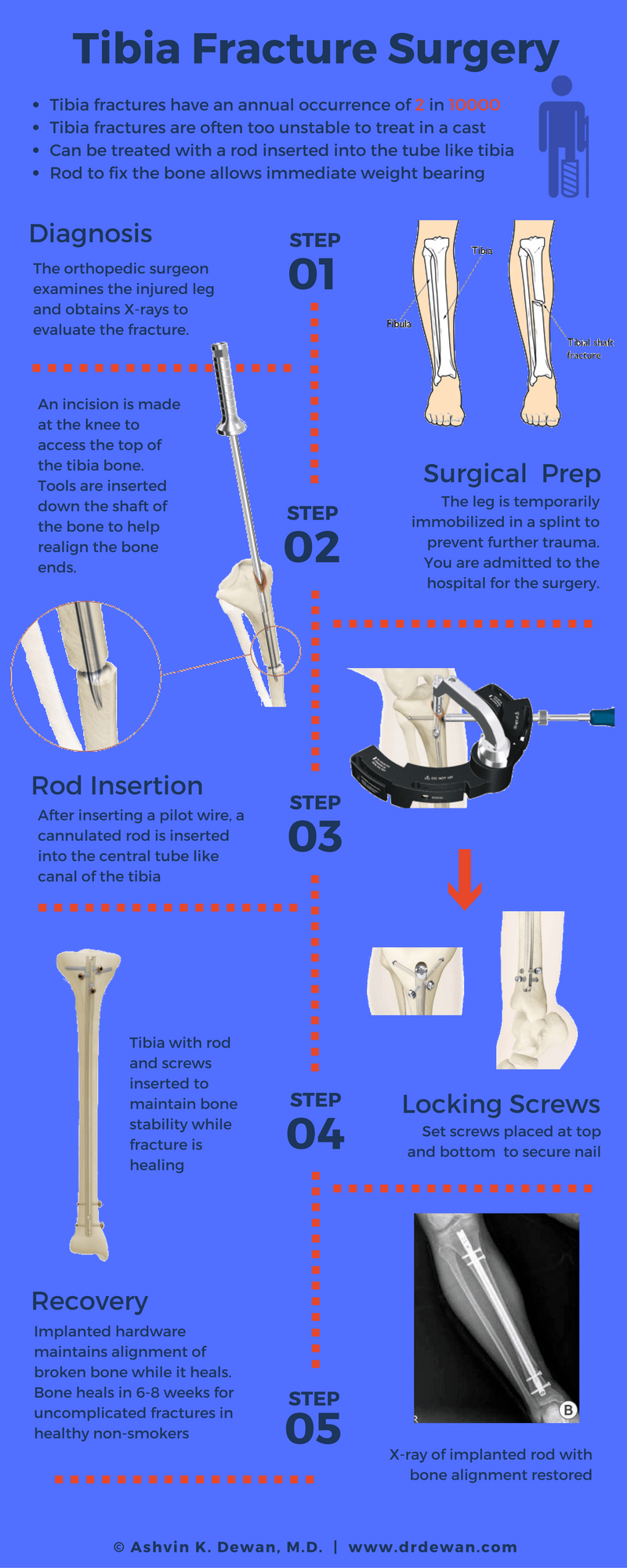 The diagram shown illustrates what a typical tibial nail implant looks like and an overview of the surgical implantation process. The surgery usually takes 1-2 hours. If the associated soft tissue injury is extensive, additional procedures may be necessary to restore the surrounding soft tissues.